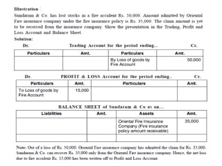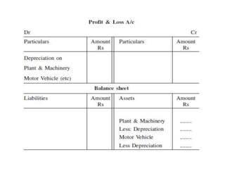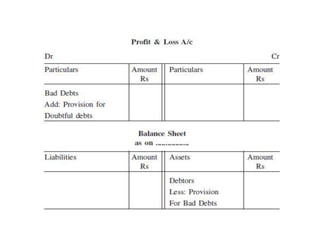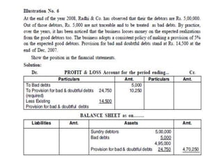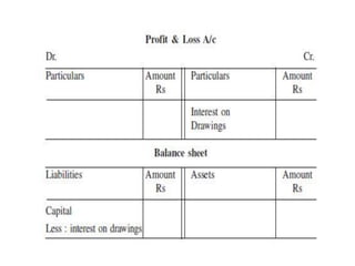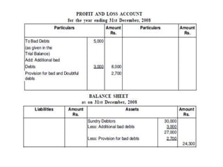 The document discusses various accounting adjustments that may be required before finalizing financial statements at the end of an accounting period. Some key adjustments mentioned include closing stock, outstanding expenses, prepaid expenses, accrued income, unearned income, depreciation, bad debts, and provisions. The effects of each adjustment on the trading account, profit and loss account, and balance sheet are explained. Common adjustments like interest on capital, drawings, and loans are also covered. The purpose of adjustments is to determine the true profit/loss for the period and accurate financial position of the business.