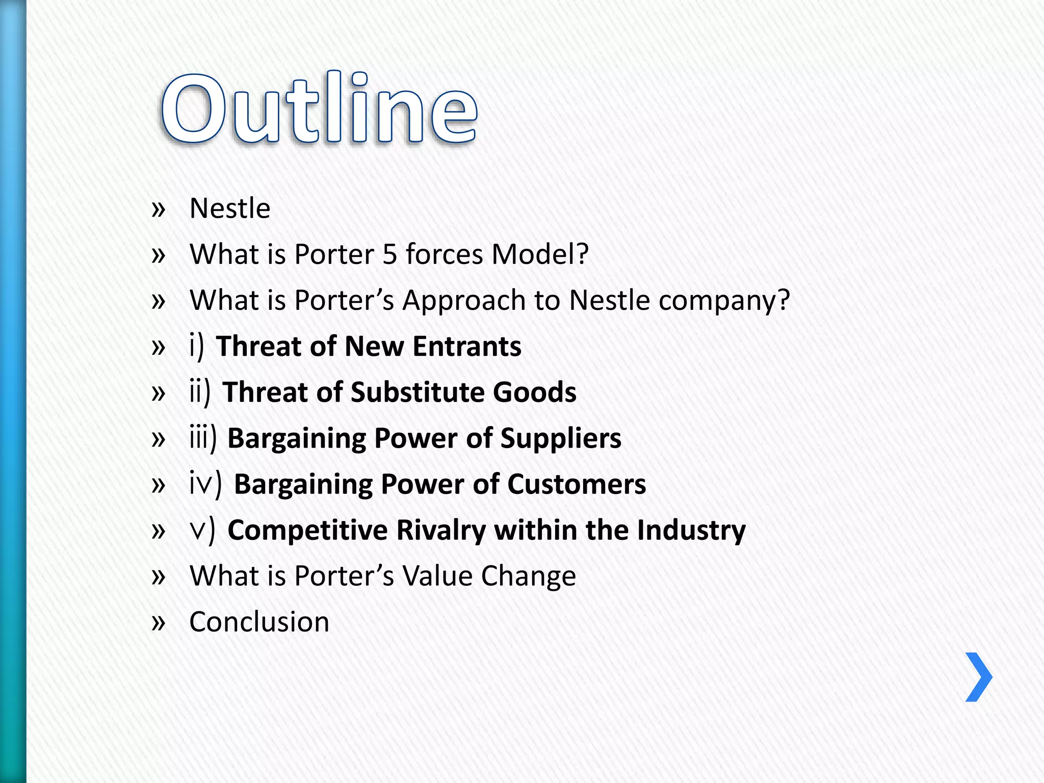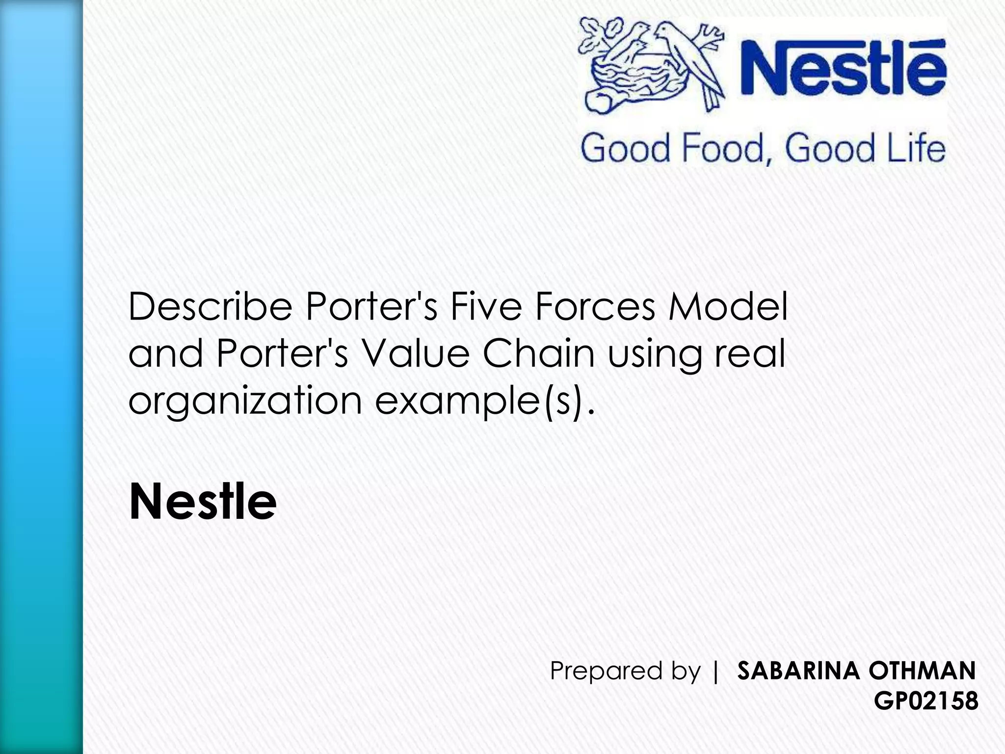 This document discusses Porter's Five Forces model and Porter's value chain model using Nestle as an example. It analyzes Nestle using the five forces of competition, threat of new entrants, threat of substitutes, bargaining power of suppliers, bargaining power of customers, and competitive rivalry. It then describes Nestle's value chain including primary activities like inbound logistics, operations, outbound logistics, marketing and sales, and services. It also discusses Nestle's supporting activities such as procurement, human resource management, technological development, and infrastructure.