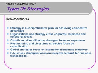 1) Types of strategies include growth, diversification, restructuring, globalization, and e-business strategies. Growth strategies focus on expansion while restructuring strategies focus on consolidation.
