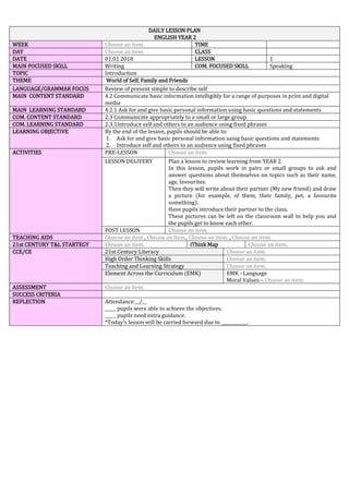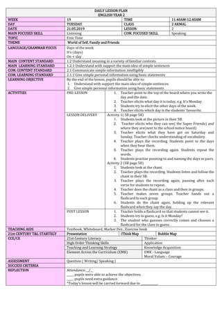 This daily lesson plan is for an English class in Year 2. The lesson focuses on free time activities and the days of the week. The objectives are for students to understand specific information in simple sentences and give simple personal information about their free time activities. Activities include singing a song about what children do on different days, asking and answering questions about each other's schedules, and miming activities to review vocabulary.