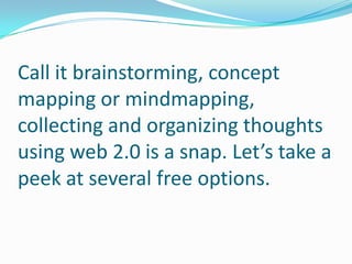 This document discusses and compares several free online tools for creating mind maps and concept maps: Bubbl.us, Mindomo, Wisemapping, Mindmeister, and Mind42. It provides a brief overview of the features of each tool, noting that Bubbl.us and Wisemapping are best for basic text-only maps while Mindomo, Mindmeister, and Mind42 allow for richer content like images, videos, notes and attachments. All the tools allow the user to start with a central idea and branch out additional ideas or thoughts connected to it in a visual web-like structure.