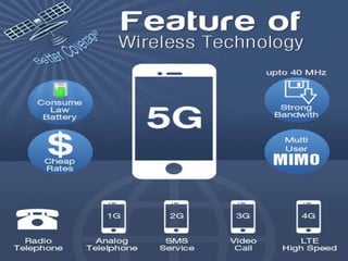 5G envisions a truly wireless world without the limitations of previous generations through integrating networks and designing a multi-bandwidth data path. 5G aims to provide very high bandwidth and change how wireless devices are used by enabling things like wireless virtual reality. It will offer extraordinary data capabilities, support unlimited call volumes and data broadcasts, and distribute internet access seamlessly worldwide through technologies like CDMA and IPv6. 5G is expected to be a new wireless revolution and promote concepts like shared infrastructure between operators.