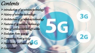 The document covers the evolution and architecture of wireless technology from 1G to 5G, highlighting major advancements in each generation. 5G, deployed widely since 2019, offers significant improvements such as ultra-fast internet speeds up to 10 Gbps, low latency, and increased bandwidth for connected devices. It utilizes an intelligent architecture with small cells and cloud-based infrastructure for enhanced efficiency and future compatibility.