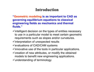 1) Geometric modeling is a fundamental CAD technique that represents objects using points, lines, curves, surfaces or solids.