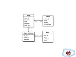 The document discusses HBase schema design, emphasizing the importance of distinguishing between logical and physical models, especially in the context of managing large data sets. It details the architecture and data model of HBase, outlining key concepts such as region hosting, data types, and the unique identifiers used for rows and columns. The text highlights the challenges of relationships in NoSQL databases like HBase, advocating for denormalization and the creative formulation of data models to accommodate the absence of traditional foreign keys and joins.
