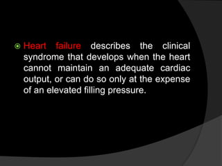 This document provides an overview of heart failure, including its causes, pathophysiology, clinical presentation, diagnosis and management. Heart failure occurs when the heart cannot pump enough blood to meet the body's needs. It may be due to conditions that weaken the heart muscle such as coronary artery disease. Symptoms depend on whether the left, right or both ventricles are affected and include shortness of breath, fatigue, swelling and fluid retention. Treatment focuses on managing symptoms, improving cardiac function and preventing future damage through medications, lifestyle changes and device therapies.