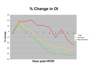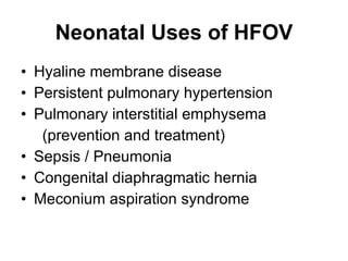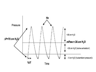 The document discusses High Frequency Oscillatory Ventilation (HFOV), including its uses in neonatal and adult patients, how it works, and how to operate it. HFOV aims to support lung oxygenation and CO2 removal while reducing ventilator-induced lung injury. It works by using very small, high frequency breaths to gently inflate the lungs rather than large tidal volumes. The settings control pressure and flow to optimize gas exchange while protecting the lung tissue.