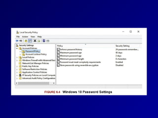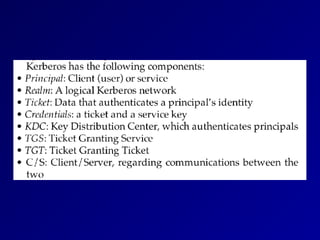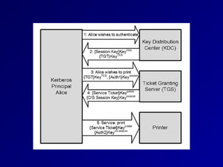 This document provides an overview of identity and access management topics including authentication methods, password types, password hashing and cracking techniques, multifactor authentication, biometric systems, access control technologies like single sign-on and Kerberos, and identity management services. The key points covered are the four types of authentication (something you know, have, are, or where you are), methods for static, one-time, and dynamic passwords, password hashing and cracking attacks, and centralized vs decentralized access control systems.
