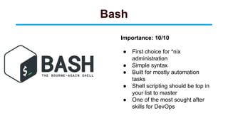 The document discusses 5 important programming languages for DevOps roles: Bash (importance 10/10), Perl (8/10), Python (8/10), Ruby (6/10), and Go (4/10). It notes that Bash is the top choice for automation tasks on Unix systems and is a very sought after DevOps skill, while Perl has a huge library of modules and is commonly required for DevOps jobs. Python is described as an all-purpose language used in applications like OpenStack. Ruby is important for configuration management tools like Puppet and Chef. Go is suitable for network and server applications.