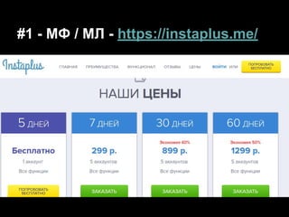Документ содержит список пяти сервисов для повышения эффективности работы в Instagram и анонс мастер-класса по таргетированной рекламе. В программе тренинга предусмотрены темы, такие как создание объявлений, выбор параметров таргетинга, управление геотаргетингом и стратегии ремаркетинга. Указаны контактные данные организатора Дмитрия Ткаченко.