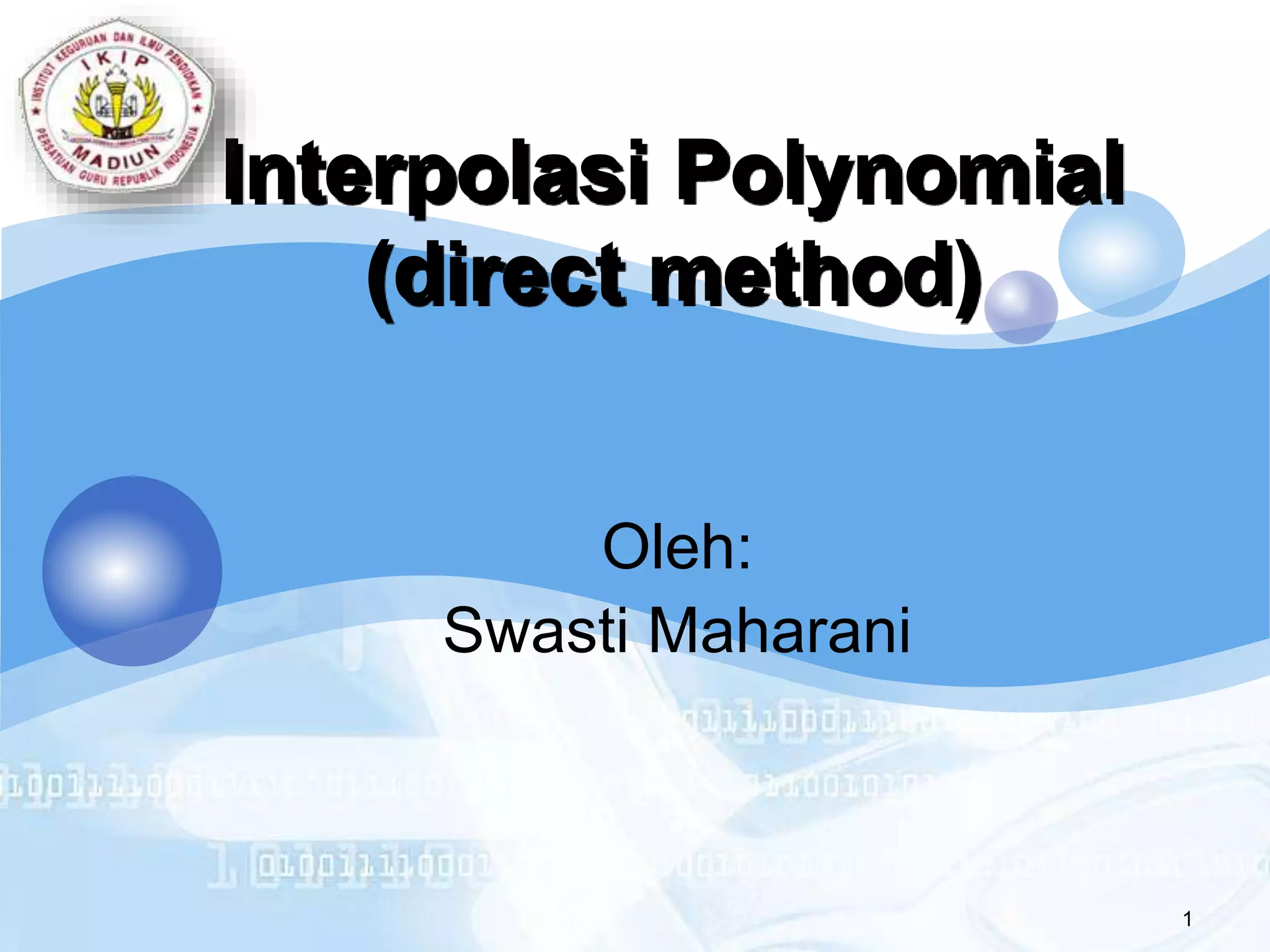 Dokumen ini membahas metode interpolasi polynomial, termasuk interpolasi linier, kuadratik, dan kubik untuk mencari nilai antara dua titik data. Metode yang digunakan bertujuan untuk mendapatkan fungsi eksak yang memenuhi semua titik data. Contoh yang diberikan meliputi penggunaan interpolasi untuk menghitung nilai f(x) pada x yang berbeda.