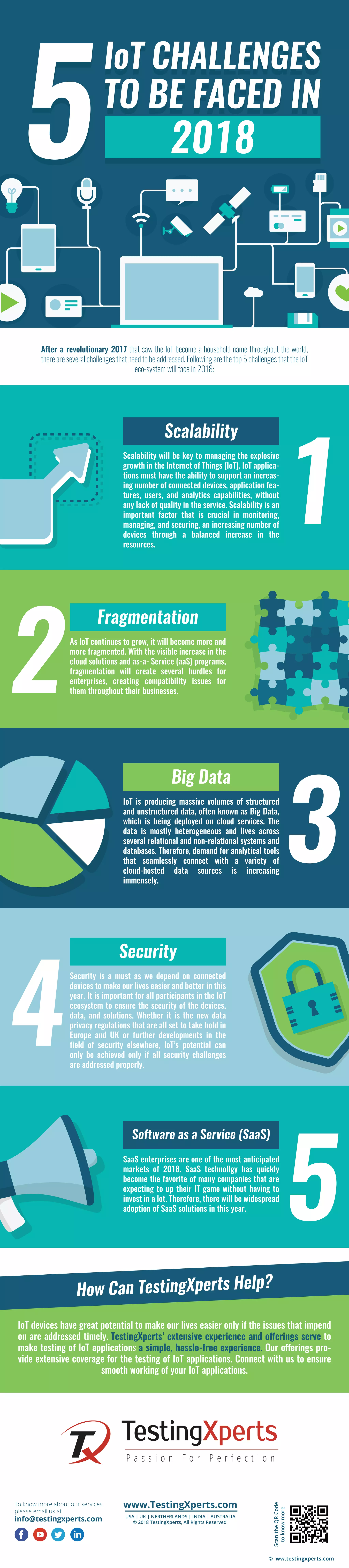 The document outlines the top five challenges facing the Internet of Things (IoT) ecosystem in 2018, including scalability, fragmentation, big data handling, security, and the rise of Software as a Service (SaaS) solutions. It emphasizes the need for improved management and security as IoT devices proliferate, alongside the necessity for analytical tools to manage diverse data sources. The document also highlights TestingXperts' role in simplifying the testing process for IoT applications.