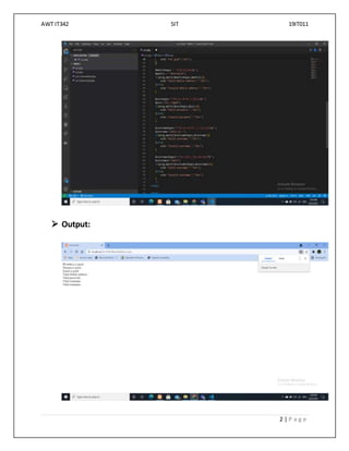 The document outlines four PHP programming practical exercises: 1) implementing form validations like IP address, domain name, email using regular expressions; 2) demonstrating five regular expression functions; 3) performing associative array operations like sorting, modifying, traversing, merging, counting elements in PHP; 4) performing numerical array operations like the ones in the previous practical. The practical sections provide the aim, sample program code, and expected output for each exercise.