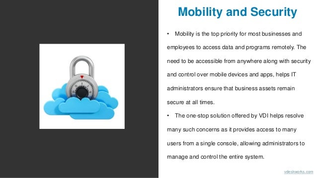 The document outlines five key elements of a complete virtual desktop solution (VDI), emphasizing its importance for mobility, control over applications, centralized administration, unified communication, and security. VDI allows businesses to manage multiple users and applications securely from a single console, improving data accessibility and administration efficiency. Additionally, it enables organizations to maintain security policies effectively while providing employees the flexibility to access necessary applications remotely.