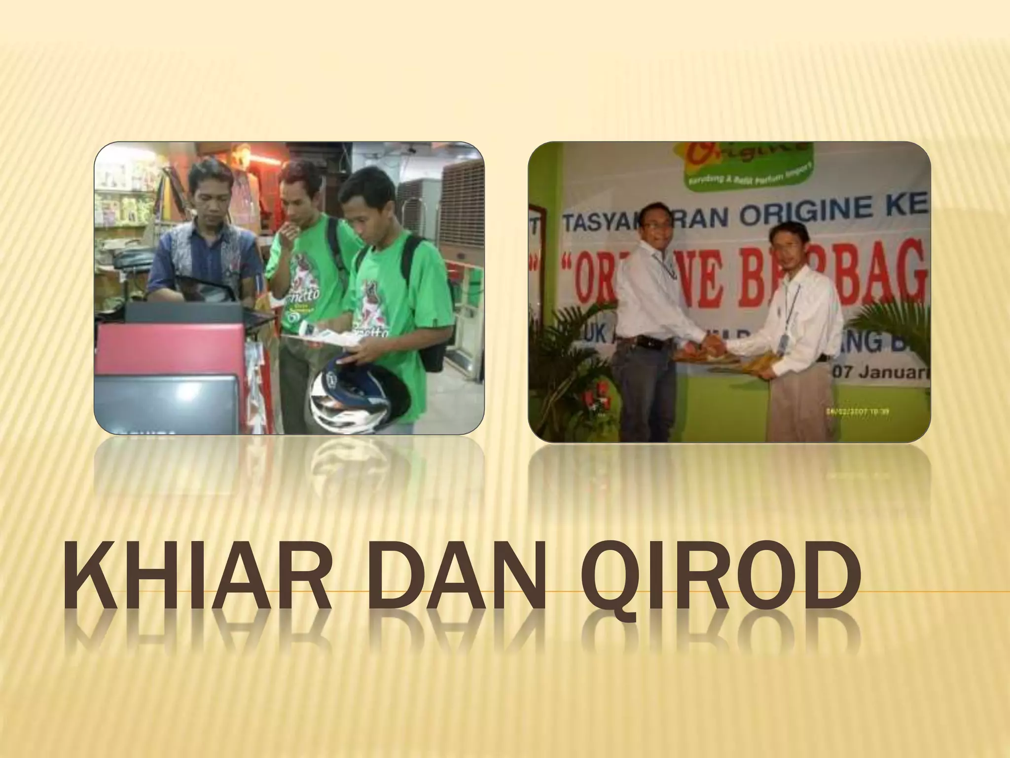 Dokumen ini menjelaskan tentang khiar dan qirod dalam konteks muamalah, termasuk definisi, tujuan, hukum serta macam-macam khiar seperti khiar majlis, khiar syarat, dan khiar aib. Selain itu, istilah qirod diuraikan sebagai pemberian modal untuk usaha dengan pembagian keuntungan yang telah disepakati. Dokumen ini juga menekankan pentingnya kedua konsep dalam menjaga keadilan dan meminimalkan penyesalan dalam transaksi ekonomi.