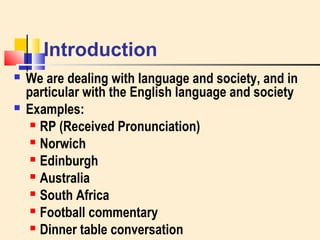 This document discusses the complex relationship between language and dialect. It begins by defining key terms like language, dialect, accent, and register. It then examines different ways languages and dialects have been categorized, such as by mutual intelligibility, prestige, size, and through the family tree model of tracing linguistic descent. However, the document notes there is no clear distinction between language and dialect, as variations exist on a continuum. Factors like politics, history and social perceptions further complicate defining and delimiting languages versus dialects.