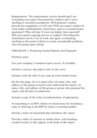 The document outlines the essential elements of writing an effective request for proposal (RFP), emphasizing the need for thorough information to guide potential bidders in crafting appropriate responses. Key components include providing company background, project descriptions, requirements, decision criteria, and clear instructions for submissions. It highlights the importance of careful consideration during the RFP stage to prevent costly issues later in the proposal and contract process.