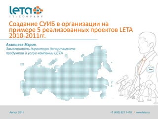 Документ описывает специфику реализации системы управления информационной безопасностью (СУИБ) в организации на примере пяти проектов, проведенных в 2010-2011 годах. Основное внимание уделяется внедрению стандартов ISO 27001 и автоматизации процессов управления с учётом требований законодательства и методик ITIL. Выводы подчёркивают уникальность каждого проекта, необходимость квалифицированного подхода консультантов и важность вовлечения высшего руководства.