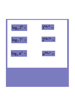 This document provides an overview of exponential and logarithmic functions: 1) It explores properties of exponential functions with the forms y = ax, where a > 1 represents exponential growth and 0 < a < 1 represents exponential decay. Key aspects like asymptotes and y-intercepts of these graphs are discussed. 2) Tables are completed and graphs are drawn to represent exponential growth and decay functions. 3) The natural logarithm function ln(x) is introduced and its graph is sketched using a calculator. Common features that logarithmic graphs share with exponential graphs are described. 4) Examples of simplifying logarithmic expressions and solving logarithmic equations are presented.