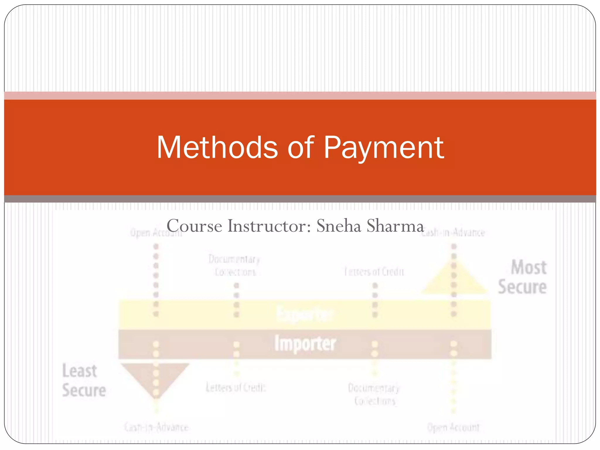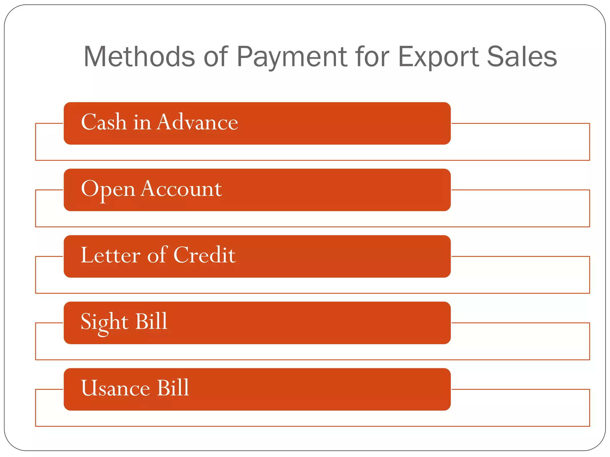 This document discusses various methods of payment for export sales, including cash in advance, open account, letters of credit, sight bills, and usance bills. Cash in advance requires upfront payment before goods are shipped. Open account allows goods to be shipped before payment is due, usually within 30-90 days, but carries the highest risk for exporters. Letters of credit provide a bank guarantee of payment if terms are met. Sight bills require payment on delivery of documents, while usance bills allow acceptance of payment within an agreed credit period after delivery.