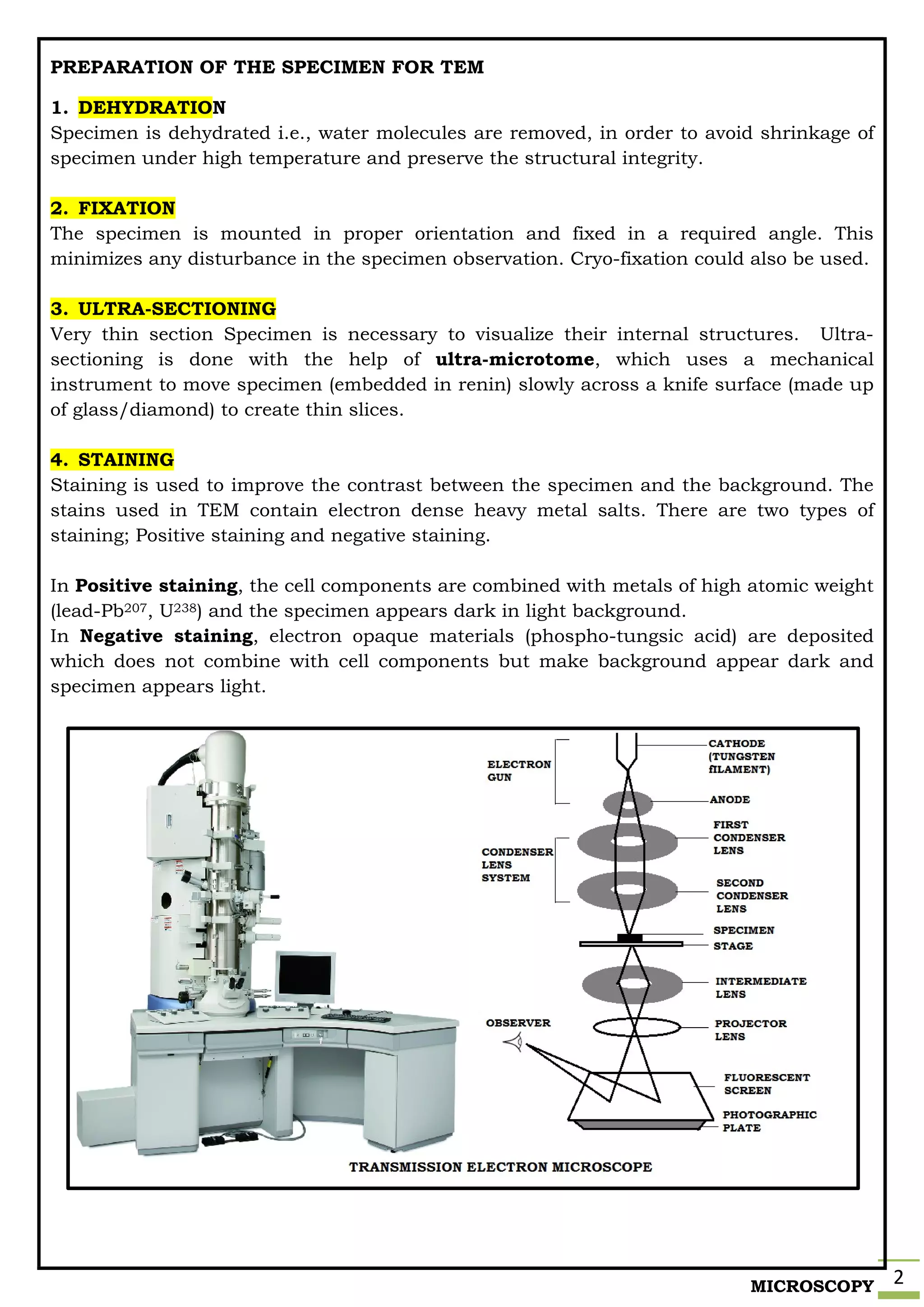 The document discusses electron microscopy, detailing its principles, types, and specimen preparation methods. It explains two main types: Transmission Electron Microscope (TEM) and Scanning Electron Microscope (SEM), highlighting their working mechanisms, advantages, and disadvantages. The document emphasizes their applications in various scientific fields and outlines the required sample preparations, including dehydration and staining techniques.