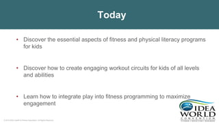 This document provides information on creating fun 5-minute workout circuits for kids that focus on physical literacy and fundamental movement skills. It discusses how keeping activities short, introducing variety, and emphasizing fun, relevance and competence can increase kids' interest in physical activity. The document outlines types of circuits like creative discovery, guided discovery, and exercise obstacle course circuits that integrate locomotor skills, stationary movement control, and manipulative skills. The goal is to keep kids moving through short stations that build skills in an engaging way.