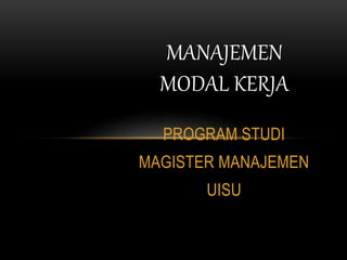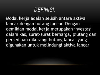 Dokumen ini membahas tentang manajemen modal kerja dalam konteks perusahaan, termasuk definisi, tujuan, sumber-sumber modal kerja, serta tipe dan dampaknya terhadap likuiditas dan profitabilitas. Modal kerja terdiri dari selisih antara aktiva lancar dan hutang lancar, serta dapat dikelompokkan berdasarkan konsep kuantitatif, kualitatif, dan fungsional. Terdapat implikasi positif dan negatif terkait pengelolaan modal kerja yang dapat mempengaruhi kinerja keuangan perusahaan.