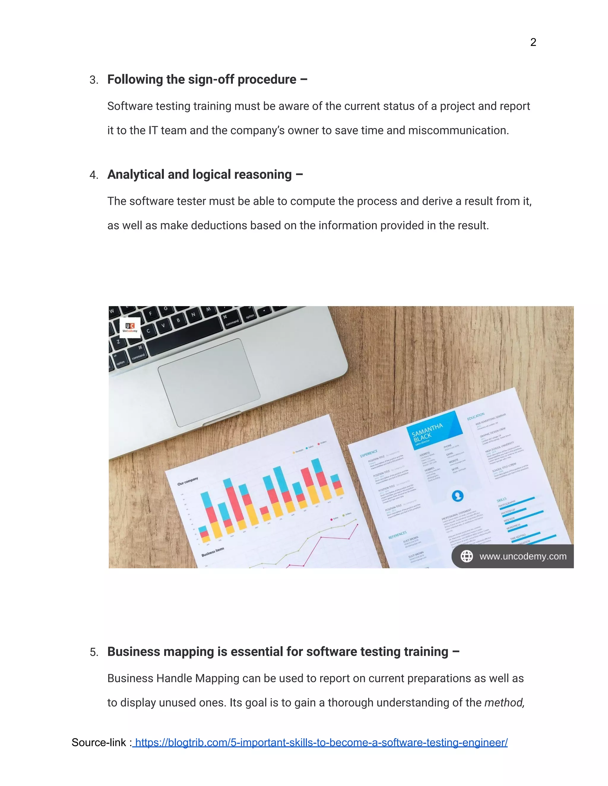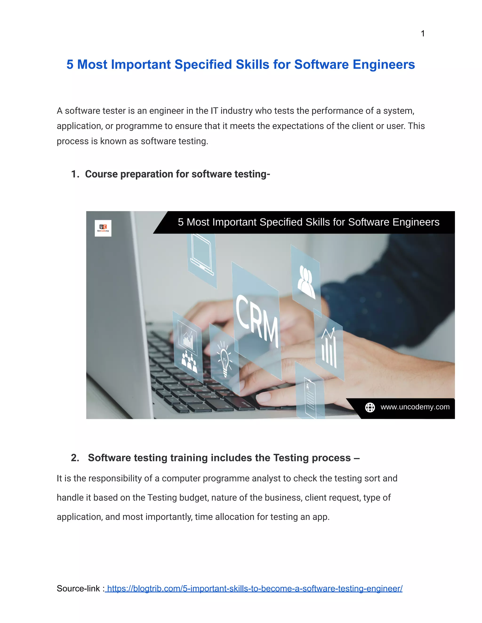 The document outlines 5 important skills for software testing engineers: 1) course preparation for software testing, 2) understanding the testing process, 3) following sign-off procedures, 4) having analytical and logical reasoning abilities, and 5) understanding business mapping. As a software tester, it is important to test applications thoroughly to meet client expectations, understand the testing budget and timeline, and effectively communicate status and results to stakeholders.