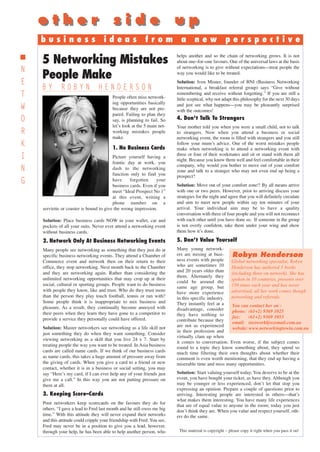 1. Five common networking mistakes are: not bringing business cards, only networking at formal events, keeping score of favors done, not talking to strangers, and not valuing yourself.