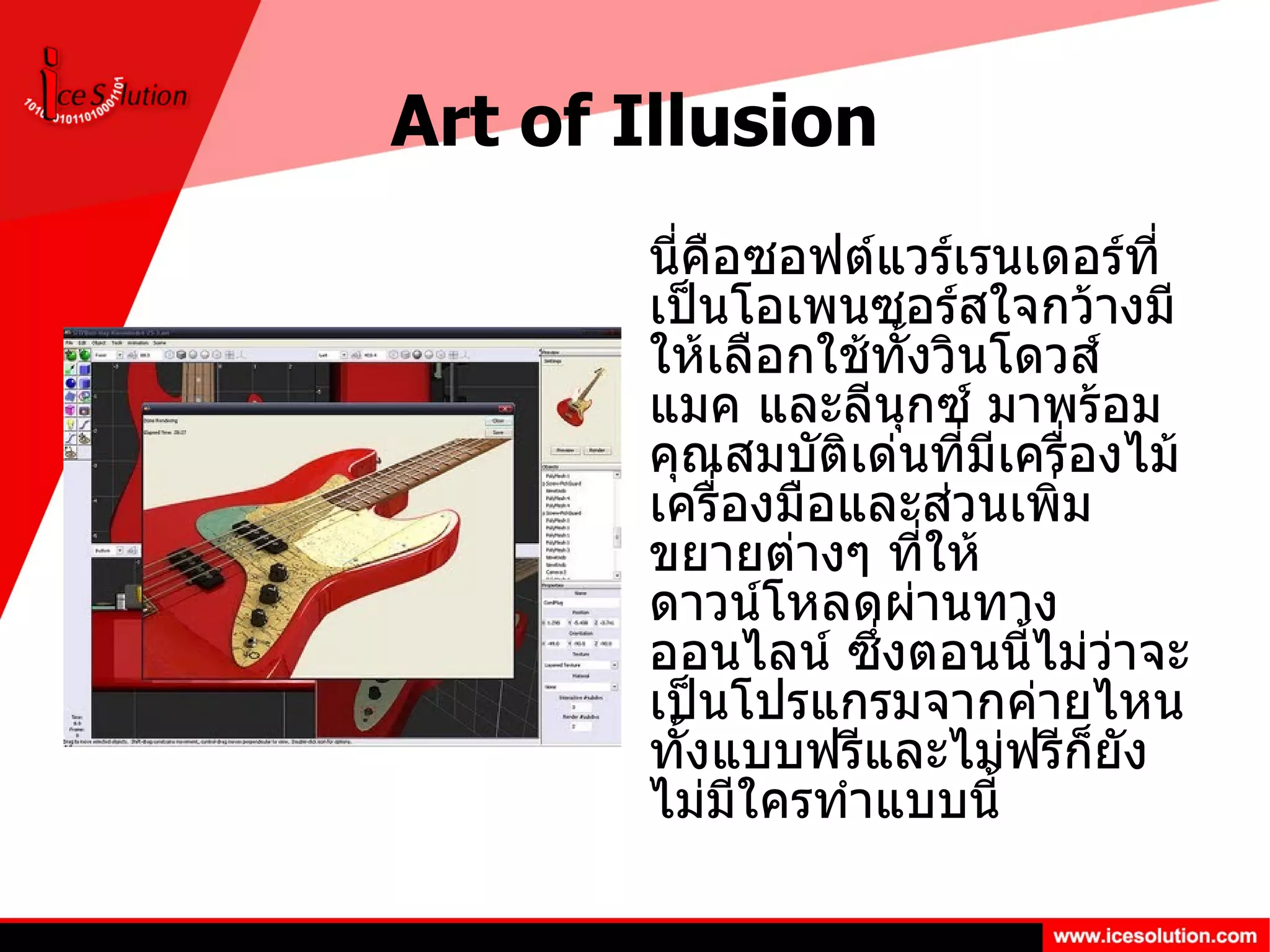 ในเวลาที่มีคนถามเกี่ยวกับโปรแกรมโอเพนซอร์สสำหรับทำการเรนเดอร์โมเดล 3 มิติ เรามักจะได้ยินคำตอบว่างานแบบนี้ก็ต้อง Blender คำตอบแบบนี้ทำให้หลาบคนเข้าใจว่าซอฟต์แวร์โอเพนซอร์สทำไมมีตัวเลือกให้น้อยอย่างนี้ ก็เลยอาศัยช่องทางนี้ทำการเผยแพร่ให้ได้ทราบกันว่าโปรแกรมทำพวกเรนเดอร์มีอยู่หลายตัวแน่นอนว่า 1 ใน 5 ก็ยังคงมี Blender รวมอยู่ในนั้น