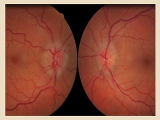This document discusses papilloedema, which refers to optic disc swelling caused by increased intracranial pressure. It defines various types of optic disc swelling including unilateral, bilateral, and papilloedema. It also discusses pseudo-papilloedema. The causes, signs, symptoms, diagnostic workup, and grading scale of papilloedema are explained in detail. Treatment options for increased intracranial pressure including idiopathic intracranial hypertension involve medical management with carbonic anhydrase inhibitors and weight loss as well as potential surgical interventions.
