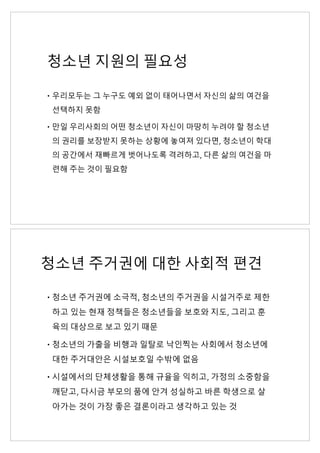 – 청소년 주거권에 소극적, 청소년의 주거권을 시설거주로 제한