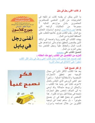 لاشك انك قرات الكثير من العناوين لكتب ودورات التدريبية مثل كيف تصبح غنياً فى مجال العقارات او الاسهم او بدء المشروعات ولكن ماذا يحدث ؟ بالنسبه للغالبيه من الناس لم يحدث لهم شئ مجرد عاصفه قصيرة من الحماس تجتاحهم ثم يعودون الى نقطة الصفر .