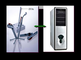 This document describes a 5 Pen PC technology that allows a computer's functions to be broken up into separate pen-sized devices that can be combined. Each pen has a specific function like a CPU, camera, projector, or virtual keyboard. When connected wirelessly using Bluetooth or WiFi, the pens allow users to access computing functions anywhere by projecting a keyboard and screen onto surfaces. The technology aims to provide ubiquitous computing in a portable form factor.