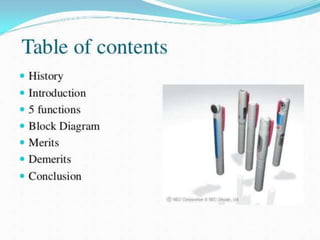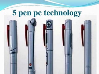 The document introduces the Five Pen PC, also called the P-ISM, a pen-style personal networking gadget that has five functions: a CPU pen, a communication pen with cellular phone function, a virtual keyboard, a very small projector, and a camera.