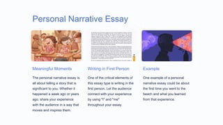 The document outlines five popular types of narrative essays: personal, descriptive, expository, and argumentative. Each type focuses on specific elements, such as first-person perspective or objective facts, to engage and inform the audience. It concludes by emphasizing the importance of choosing the right type based on the audience, purpose, and message.