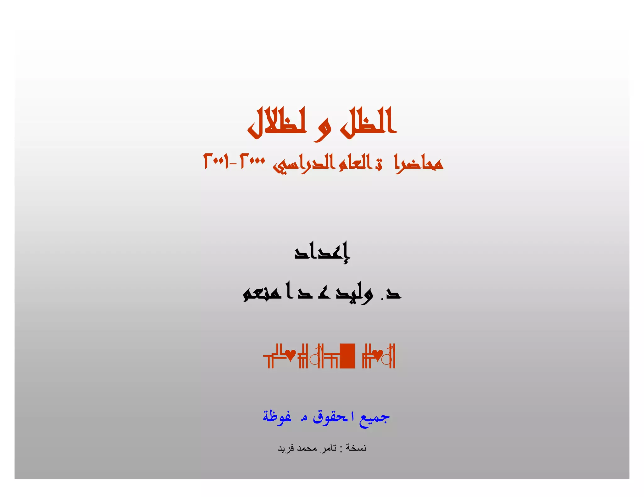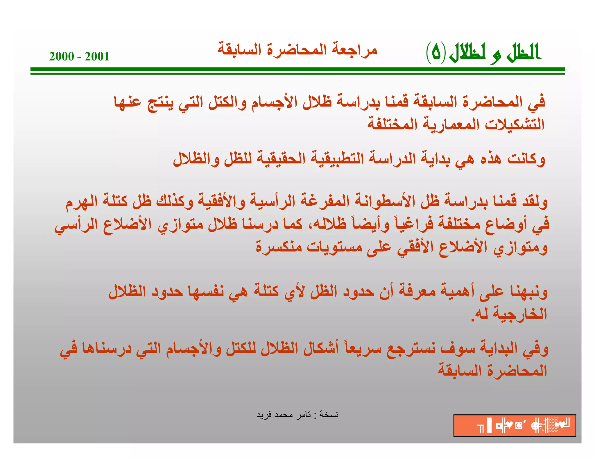 تناقش الوثيقة مفاهيم الظل والظلال في السياق المعماري، حيث تم استعراض أنواع الظلال الناتجة عن أشكال مختلفة مثل الأسطوانات والهرم وموازي الأضلاع في مواضع متنوعة. تتطرق المحاضرة إلى أهمية معرفة حدود الظل لتسهيل تحديد حدود الظلال، وتعرض أيضًا بعض التطبيقات العملية للظلال على العناصر المعمارية كالسلالم والفتحات. تم تضمين ملاحظات هامة حول طرق حساب الظلال وكيفية تحديد العناصر المسؤولة عنها.