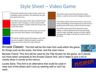 The document provides details on fonts, colors, and images that will be used in a pre-production style sheet for a video game. It includes the names and intended uses of 8 fonts as well as colors that will be used for characters, scenery, and other elements. Images from two similar games are referenced as inspiration for the graphical style. Layouts and rationale for the game's score display, timer, character design, and forest/city backgrounds are also discussed.