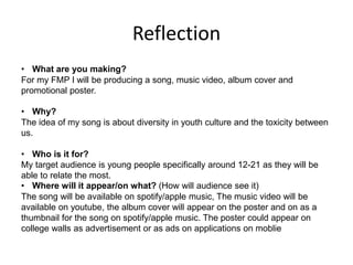 For their FMP, the student will produce a song, music video, album cover, and promotional poster about diversity in youth culture and toxicity between groups. The song will be available on streaming platforms like Spotify and Apple Music. The music video will be on YouTube. The album cover and poster will advertise the song. The target audience is 12-21 year olds who will relate to the message. Throughout the products, a consistent color scheme inspired by urban graffiti will be used to portray the atmosphere and ideas of youth culture.