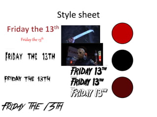 This document outlines the pre-production planning for a short film titled "Friday the 13th". It includes details on the title sequence layout, establishing the masked killer, lighting setup, required props and locations, contingency planning for issues like bad weather, and a proposed 5-day production schedule. The title sequence will use red text and fading elements to set a dark, horror tone. The masked killer will be revealed on screen to establish the film. Necessary props include a hockey mask, machete, and outdoor clothing. Locations will include a dark forest and house.