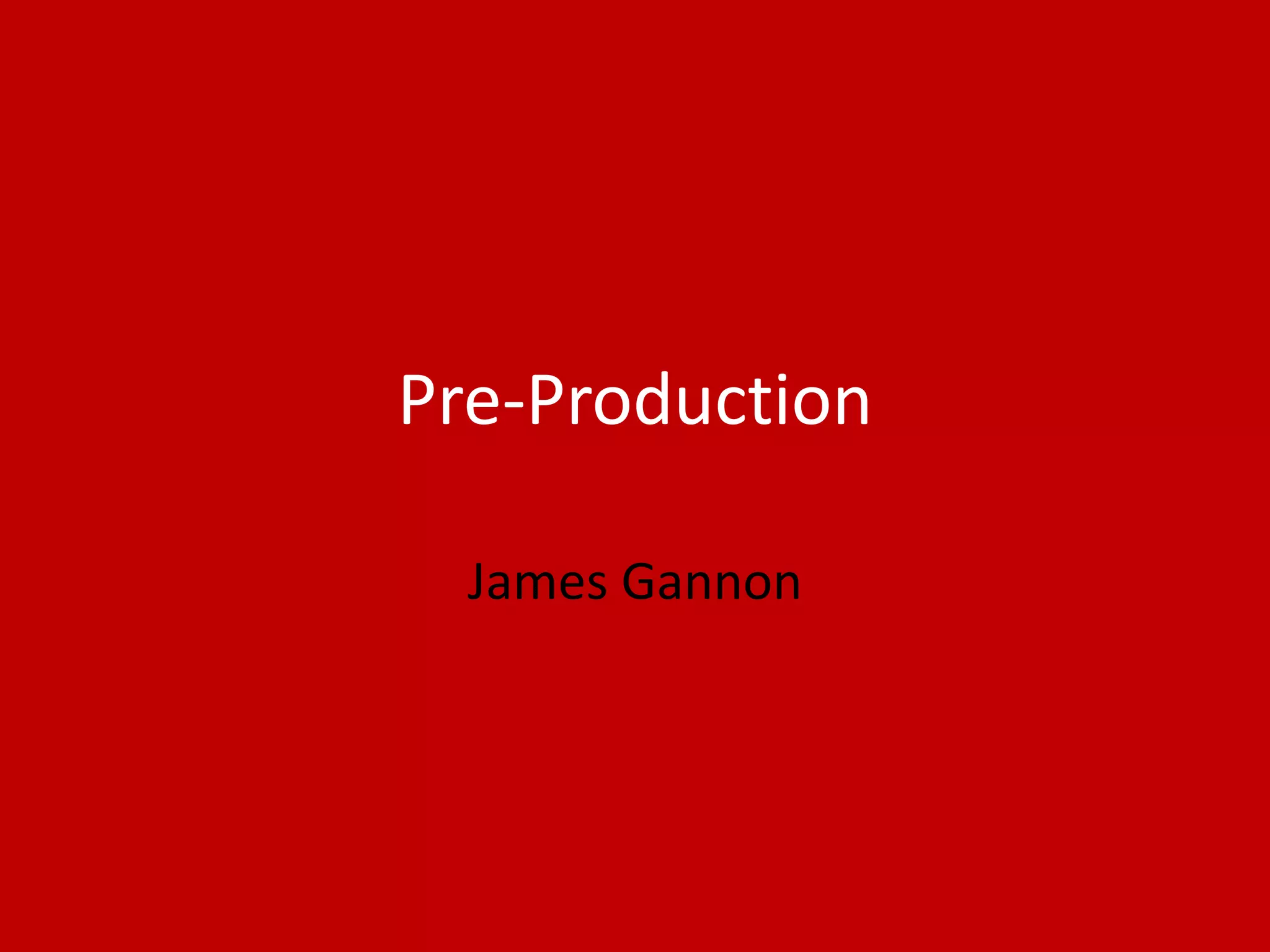 This document outlines James Gannon's pre-production plan for a photography project. It includes style guidelines for different photography elements, expected photo colors, potential photo edits using tools like the smudge tool, an example landscape photo, required props and locations, contingency plans for issues like weather, and a 8-day schedule for taking, editing, and compiling photos into a collage.