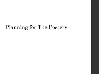 The document discusses plans for posters and a trailer for a film project. It describes three poster designs - an iconography poster showing a plague doctor mask and axe, a close-up of a tortured victim's face, and a bloodied axe in a sink. For the trailer, it outlines the film's plot about a man who tortures people after his girlfriend's death. It also discusses following conventions like dark colors and lighting for the horror elements and warmer tones for early romantic scenes to establish the protagonist's motivation.