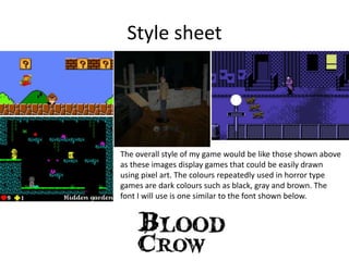 The document outlines the pre-production plans for a pixel art horror game. It discusses using dark colors like black, gray, and brown. Photoshop will be used for the pixel art, characters, and level design. Contingency plans include backing up work to multiple USB drives in case of data loss or corruption. The schedule plans collecting images on day 1, designing characters and props on day 2, finding audio on day 3, and placing characters on levels on day 4.