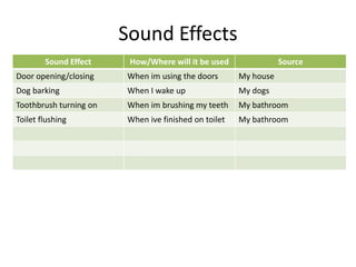 This document outlines the pre-production plan for a podcast. It includes a list of needed sound effects and their sources, a music track to be used, required props and locations, contingency plans for potential issues, health and safety considerations, and a weekly schedule of tasks from script writing to video uploading. Sound effects from around the producer's house will be recorded, and potential issues like bad audio will be addressed in editing. A testing plan is in place for COVID-19 and precautions for structural safety. The schedule allocates days for scripting, cleaning, recording, and editing before uploading the finished podcast online.