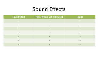This document outlines the pre-production plan for a podcast. It includes sections for sound effects and music with placeholders for details to be added. It also lists potential props and locations needed as well as contingencies for technical issues. Health and safety considerations are addressed along with potential solutions. A weekly schedule is provided with 8 tasks over 8 days including writing a script, recording, and editing the podcast as well as creating PowerPoints and publishing the final product.
