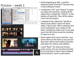 Jack Bevens describes his 6-week process of editing a music video. In week 1, he imported video clips into Premiere Pro and organized them on different layers. He used the razor tool to chop and remove scenes. In week 2, he added video transitions like dissolves between scenes to make the video flow better. In week 3, he added subtitles in a readable font and color. In week 4, he struggled to sync a downloaded song to the video. In week 5, he added adjusting layers of different colors to match the beat. In week 6, he exported the video and uploaded it to YouTube to share with others.