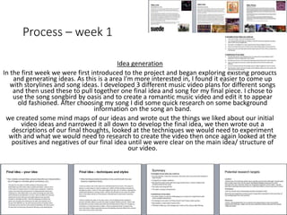 In the first week, the student generated ideas and developed three music video concepts before choosing to create a romantic music video for the song "Songbird" by Oasis styled to look old fashioned. In week two, the student researched techniques and styles by watching other music videos and films to get inspiration. Week three involved experiments with different filming techniques and styles to determine what worked best. In week four, the student filmed footage around York over two days and spent a long time editing and adding effects to achieve the desired old film look. For week five, the student finished editing and uploading the video before evaluating the project, identifying strengths and areas for improvement.
