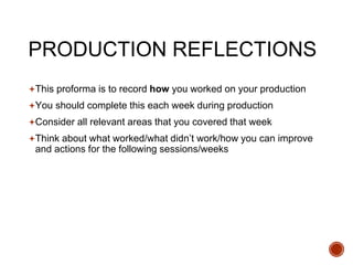 This document contains weekly reflections from a student on their process of creating a video production over 5 weeks. In week 1, the student learned camera skills and filmed initial clips with their group. They struggled with storyboarding and keeping the camera focused. In week 2, they conducted research and worked on their proposal. They felt they need to apply their research more. In week 3, they continued planning but struggled with storyboarding and shot lists. Risk assessment was easier. In week 4, they began filming and editing but found it time consuming. They need to improve time management and editing skills. In week 5, they continued editing but struggled with specific tools and recording clear audio.