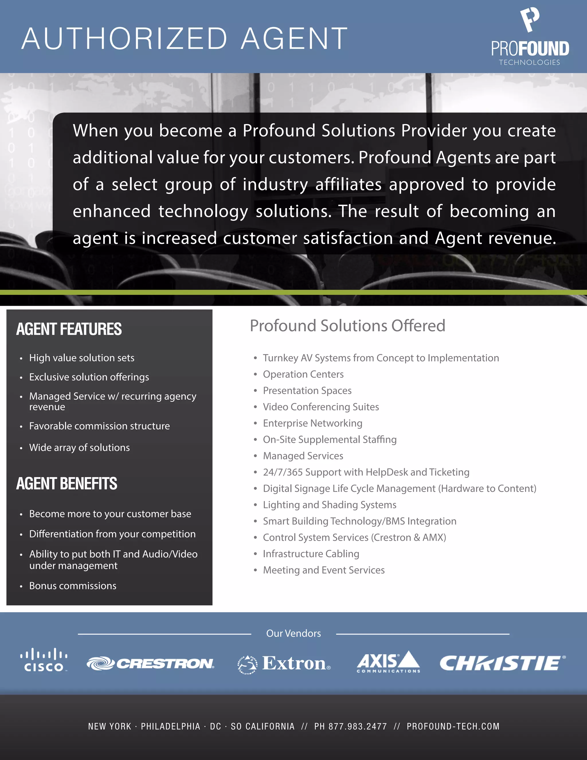By becoming a Profound Solutions Provider, agents can offer high value IT and audio/video solutions to their customers, generate recurring managed service revenue, and receive favorable commission structures. Agents will differentiate themselves from competition by putting both IT and audio/video solutions under management, increasing customer satisfaction and their own revenue. Profound offers exclusive solutions across areas like AV systems, video conferencing, networking, managed services and more.