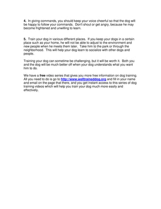 1. Training a dog requires patience, consistency, and positive reinforcement through treats and praise. It is best if one person is responsible for training to avoid confusion.